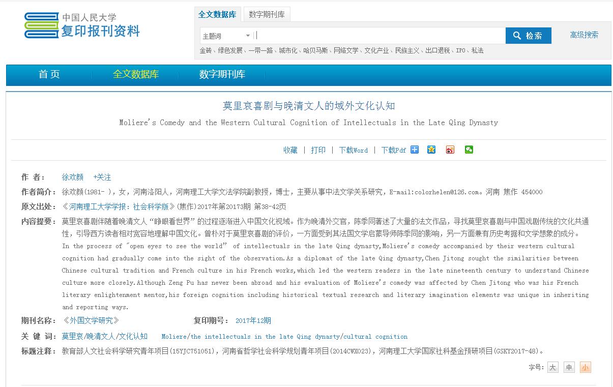 中心近日获悉,社科版学报2017年第3期刊发的我校文法学院徐欢颜博士的论文《莫里哀喜剧与晚清文人的域外文化认知》被中国人民大学书报资料中心列刊之一《外国文学研究》2017年第12期全文转载。