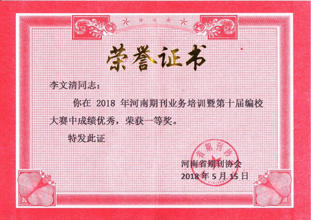 近日,河南省期刊协会发布了河南省第十届编校大赛获奖人员名单,李文清副编审获得一等奖。
