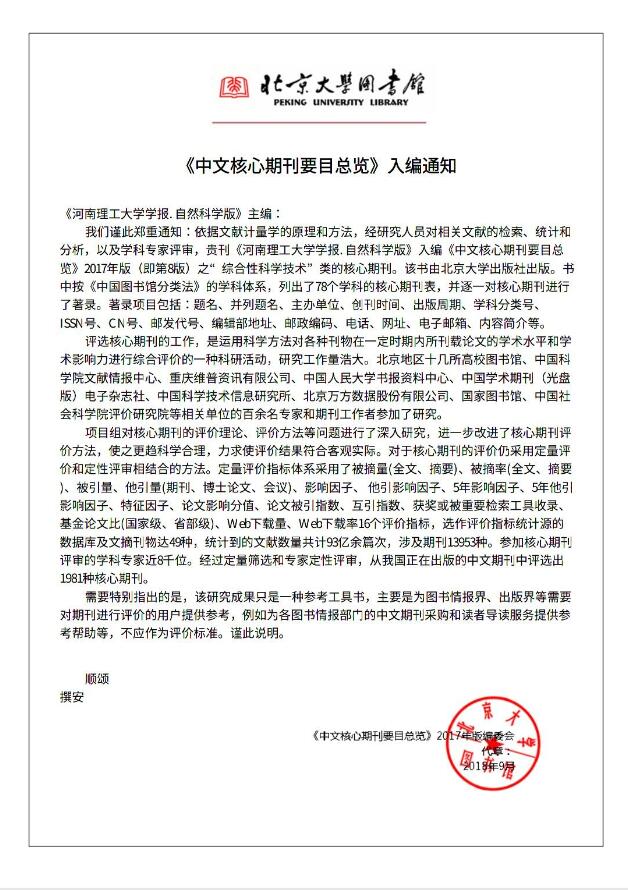 近日,中心收到《中文核心期刊要目总览》编委会通知,《河南理工大学学报(自然科学版)》再次入选《中文核心期刊要目总览》2017年版(第8版)。