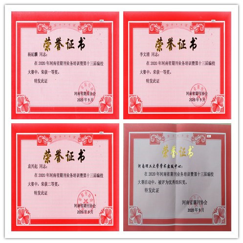 近日,从河南省期刊协会传来喜讯,在河南省期刊第十三届编校大赛上,中心编辑人员表现优异,再获佳绩——杨延麟、李文清荣获一等奖,袁兴起荣获二等奖,学术出版中心荣获优秀组织奖。