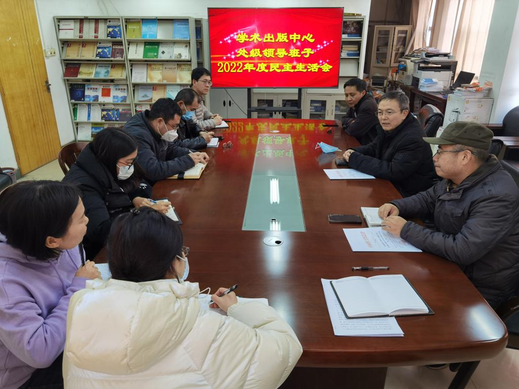 2月14日下午,中心在力行楼420室召开了处级领导班子2022年度民主生活会。此次民主生活会的主题是:全面贯彻习近平新时代中国特色社会主义思想,深刻领悟“两个确立”的决定性意义,增强“四个意识”、坚定“四个自信”、做到“两个维护”,团结带领党员干部师生以奋发有为的精神贯彻落实党的二十大作出的重大决策部署,扎实推进学术出版工作,助力学校事业高质量发展。全体党员干部参加会议,会议由党支部书记、中心主任朱雪里主持。