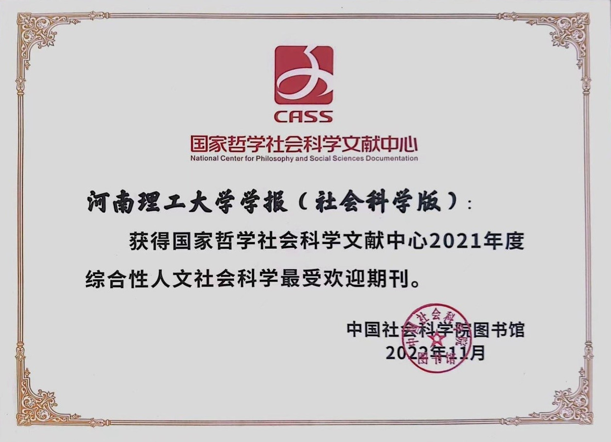 近日,国家哲学社会科学文献中心发布《中文期刊用户关注度报告(2021年度)》。《河南理工大学学报(社会科学版)》荣获 “2021年度综合性人文社会科学最受欢迎期刊”。这是刊物获评“2020年度综合性人文社会科学最受欢迎期刊”后,再次获得该项荣誉。