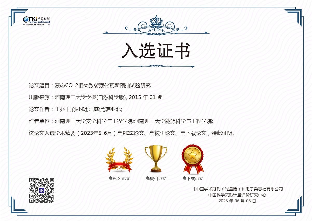 以我校安全科学与工程学院王兆丰教授为第一作者的《液态CO_2相变致裂强化瓦斯预抽试验研究》(自然科学版学报2015年第1期)总被引频次为137次,总下载频次为1353次,PCSI指数为36.931;以资源环境学院潘结南教授为通讯作者的《不同变质变形煤微晶结构的XRD试验研究》(自然科学版学报2019年第1期)总被引频次为21次,总下载频次为822次,PCSI指数为3.326;以马克思主义学院研究生张品为独立作者的《“获得感”的理论内涵及当代价值》(社会科学版学报2016年第4期)总被引频次为252次,总下载频次为5729次,PCSI指数为27.819。以上三篇论文的总被引频次、总下载频次和PCSI指数三项指标在当年本学科领域的排名均进入全国前1%,获称“三高”(高被引、高下载、高PCSI)论文。此成绩的获得扩大了我校相关学科的学术影响力。