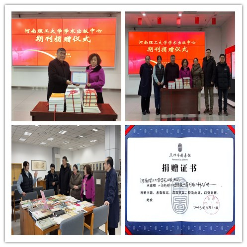为打造学术资源共建共享平台,助力文化和学术传播,进一步扩大《河南理工大学学报》影响力,中心于12月11日在焦作市图书馆开展了期刊捐赠公益活动。中心主任茅艳、副主任杨延麟及各科室负责人参加了捐赠仪式,焦作市图书馆副馆长袁爱民代表市图书馆接受了捐赠。