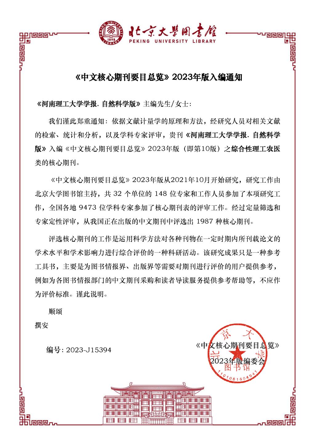 12月26日,中心收到北京大学图书馆、《中文核心期刊要目总览》2023年版编委会邮件正式通知:《河南理工大学学报(自然科学版)》入编《中文核心期刊要目总览》2023年版(即第10版)之 “综合性理工农医” 类核心期刊。这是该刊再次入选《中文核心期刊要目总览》,也是今年继入选“煤炭领域高质量科技期刊”和“地球科学领域高质量科技期刊”后获得的又一项重要荣誉。