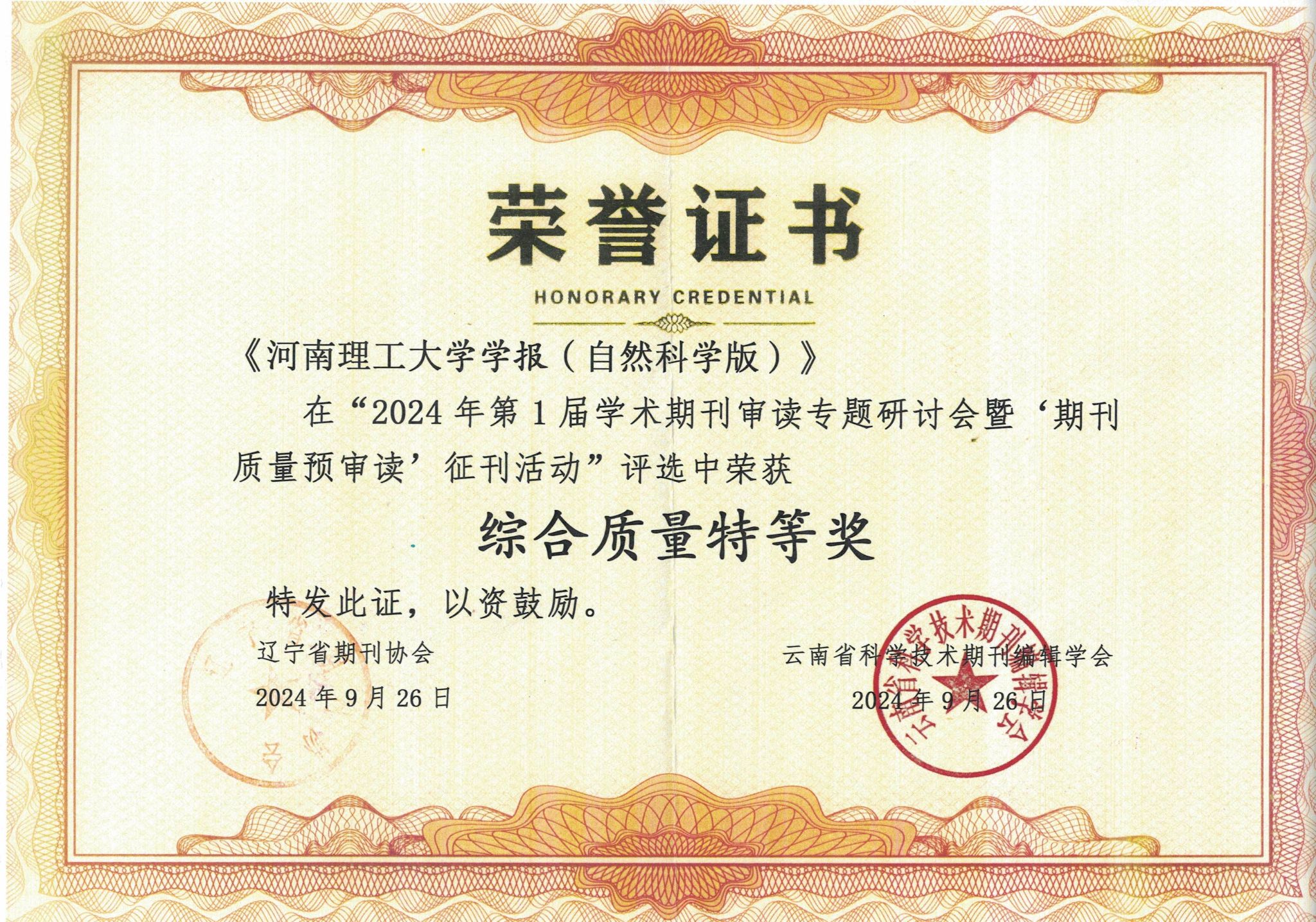 为进一步贯彻落实全会精神及习近平总书记提出的“着力推动高质量发展,主动构建新发展格局”“要加快培育世界一流科技期刊”重要指示精神,近日,辽宁省期刊协会、云南省科学技术期刊编辑学会在山东济南联合举办了“2024年第1届学术期刊审读专题研讨会暨‘期刊质量预审读’征刊活动”。《河南理工大学学报(自然科学版)》凭借其在出版导向、内容质量、编校质量、出版形式和印刷质量等方面的卓越表现,在此次评选中荣获“综合质量特等奖”。