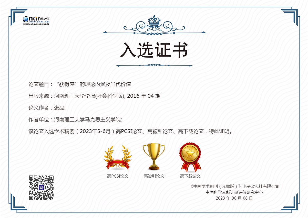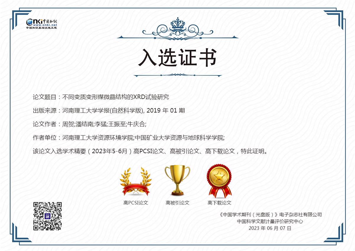 以我校安全科学与工程学院王兆丰教授为第一作者的《液态CO_2相变致裂强化瓦斯预抽试验研究》(自然科学版学报2015年第1期)总被引频次为137次,总下载频次为1353次,PCSI指数为36.931;以资源环境学院潘结南教授为通讯作者的《不同变质变形煤微晶结构的XRD试验研究》(自然科学版学报2019年第1期)总被引频次为21次,总下载频次为822次,PCSI指数为3.326;以马克思主义学院研究生张品为独立作者的《“获得感”的理论内涵及当代价值》(社会科学版学报2016年第4期)总被引频次为252次,总下载频次为5729次,PCSI指数为27.819。以上三篇论文的总被引频次、总下载频次和PCSI指数三项指标在当年本学科领域的排名均进入全国前1%,获称“三高”(高被引、高下载、高PCSI)论文。此成绩的获得扩大了我校相关学科的学术影响力。
