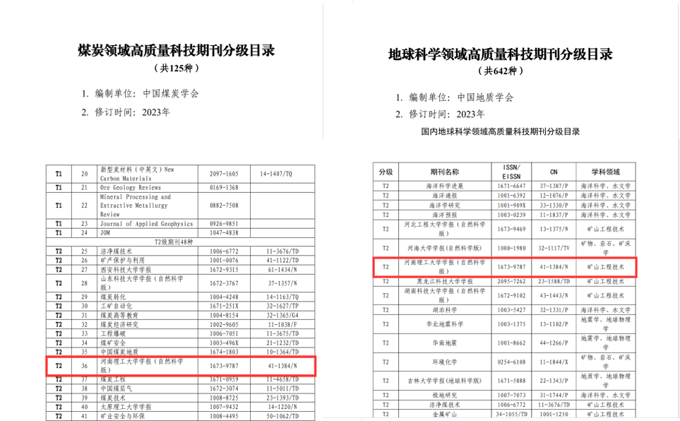 近日,中国科学技术协会网站公布了《高质量科技期刊分级目录总汇(第三版)》。《河南理工大学学报(自然科学版)》入选“煤炭领域高质量科技期刊分级目录T2级”和“地球科学领域高质量科技期刊分级目录T2级”。这是该刊继2020年入选《高质量科技期刊分级目录总汇》后,再次获此殊荣。